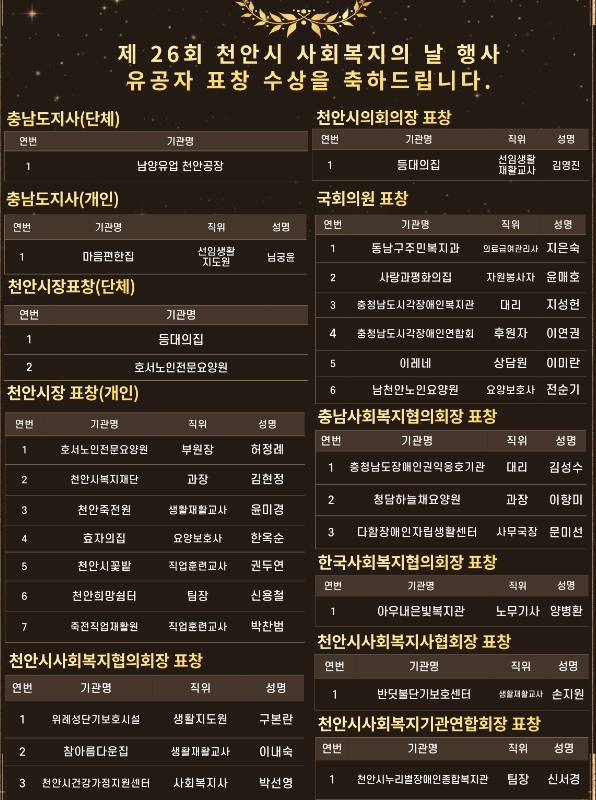 제 26회 천안시사회복지의 날 행사 유공자 표창수상 페이지 정보 작성자작성자 : 천사협 조회조회수 : 643회 작성일작성일 : 25-09-23 13:14 본문 수상을 축하 드립니다! 목록 다음글「제26회 천안시사회복지의 날 행사」사회복지 유공자 추천 협조 요청 25.07.28
